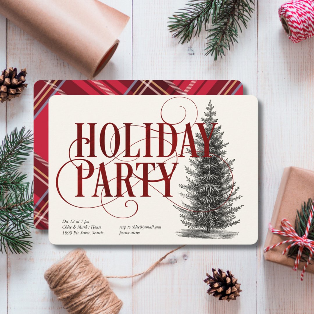 Vintage Tree Holiday Party Invitation christmas invitations Vintage Tree Holiday Party Invitationby StudioFortyDesign A vintage tree adorns this classic holiday party invitation. Back side features a classic plaid. Comments