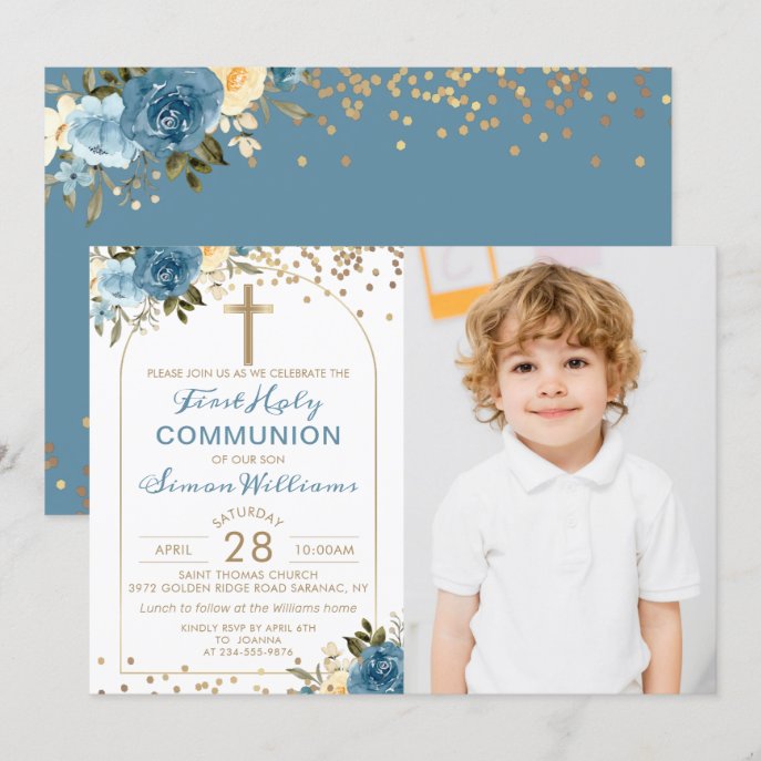 Arch Gold Navy Blue Floral First Communion Photo Invitation religious Arch Gold Navy Blue Floral First Communion Photo Invitation $2.35 by PollyFunDesign Comments