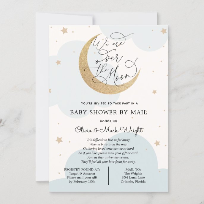 Over the Gold Moon Blue Baby Shower By Mail Invitation baby shower invitations Over the Gold Moon Blue Baby Shower By Mail Invitation $2.55 by AdorePaperCo Comments