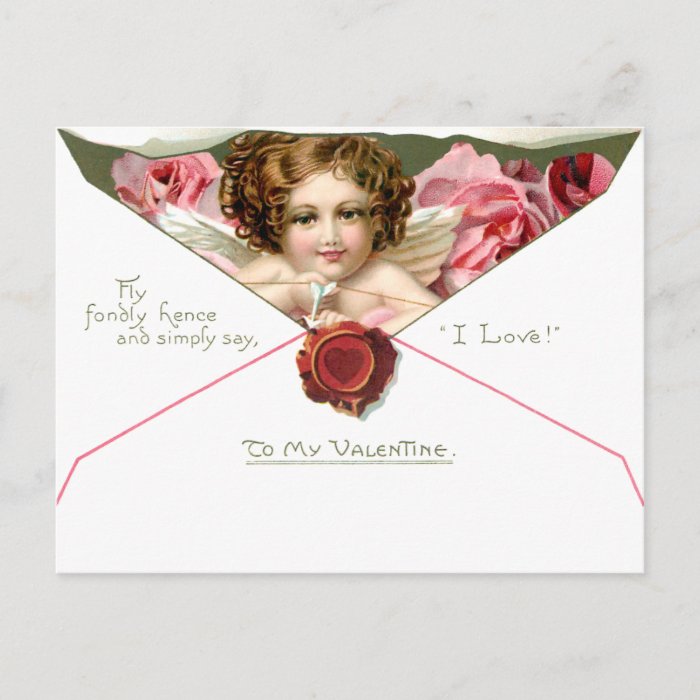 Vintage Valentine Cupid with Pink Roses Postcard valentine Curly-haired vintage winged cupid holding arrow and peeking out from Valentine envelope with red heart wax seal surrounded by pink roses with Valentine message. Comments