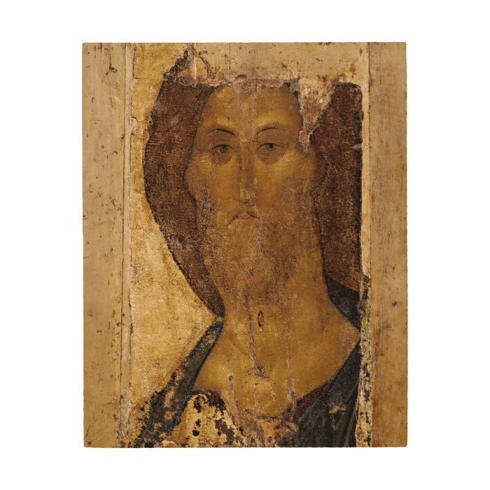 The Saviour was found in 1919 in a woodshed in Zvenigorod near Moscow. Once it was a part of a Deisius (a composition with Christ in the center) with 7 figures. The icon inspires trust and hope and bears the principle of Good. - A wood canvas? As the icon was originally painted on wood I thought it fitting that it wood now also be printed on wood.