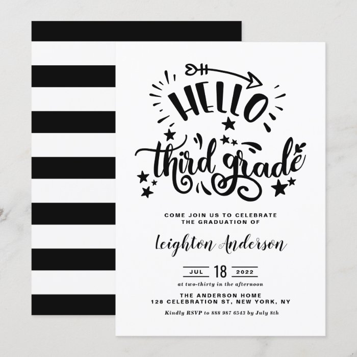 Hello third grade! Invite guests with this customizable second grade graduation invitation. It features black whimsical modern calligraphy. Personalize this black and white second graduation invitation by adding your event details. This calligraphy 2nd grade graduation invitation is available in other colors and cardstock.