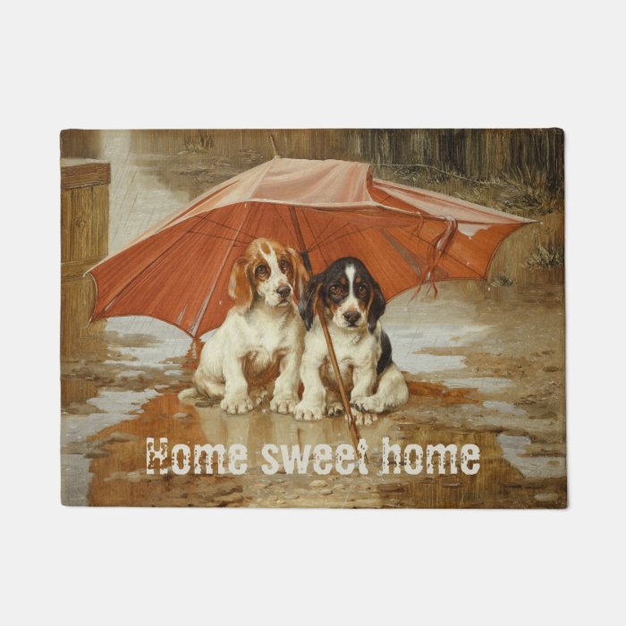 Doormat inspired by a 1893 oil painting by British 'dog painter' William Hamilton Trood ('Wait till the the clouds roll by Bassett pups').The default text for this design is 'Home sweet home'... because you know sometimes it's really really good to have a home a place where you can feel safe and sheltered. Personalize the design simply by typing over the example text.