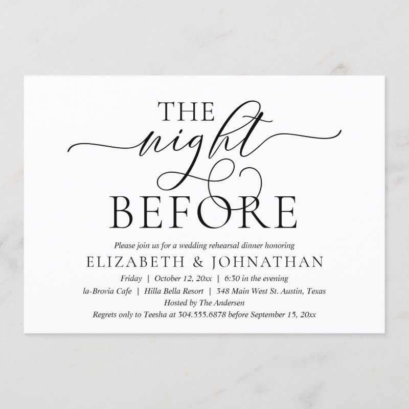 Modern Romantic Calligraphy Black Script Wedding Rehearsal Dinner invitation card (with card title: the night before). It is perfect for your wedding rehearsal dinner celebration party before your best day. Add your details in matching black font / lettering. #TeeshaDerrick