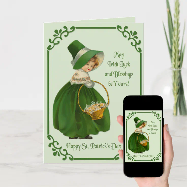 Irish Colleen Card (Downloadable) st patrick Irish Colleen Cardby Memory_LaneVintage design features a young Irish girl with a basket of lucky Shamrocks. This wee Colleen is dressed in green with matching bonnet and scroll border. Design has been hand retouched. Front text say Comments