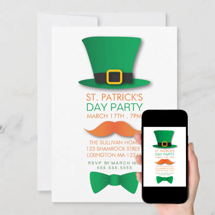 Invite your friends for a night of being Irish with this fun invitation to your St. Patrick's Day celebration! A leprechaun's hat, ginger mustache and snazzy bow tie frames your party details in mode