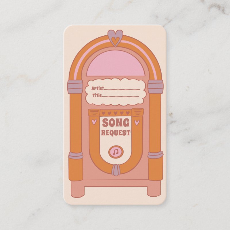 This retro illustration of a jukebox features a boho terracotta, burnt orange and pink color palette and retro style text. This would be perfect to include with your wedding or party invitations or leave around your event so that people can request songs from the Wedding DJ or Wedding band. This would suit any style of event particularly those with a vintage, boho, 1970s or retro theme.