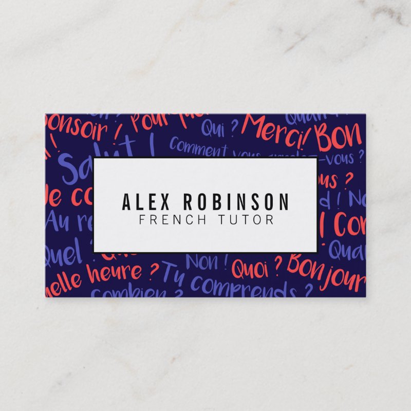 A modern design featuring beginner french phrases in coral and blue on a navy blue background. In the middle, there is a white box with a black outline for your name and profession, or a business name and tagline. This would be perfect for a french language teacher or a private tutor. On the back, the design is repeated with more space for your details.