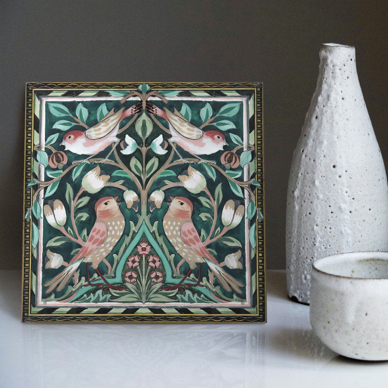 William Morris Birds and Tulips Green Art Nouveau Ceramic Tile