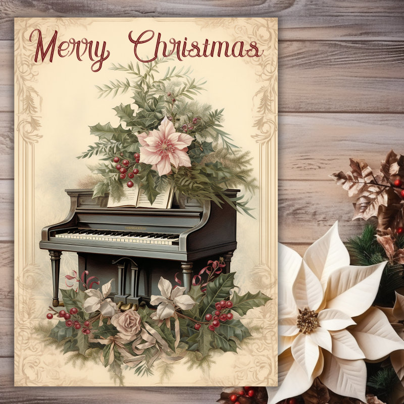 Vintage Christmas Music Grand Piano Greenery Holiday Card