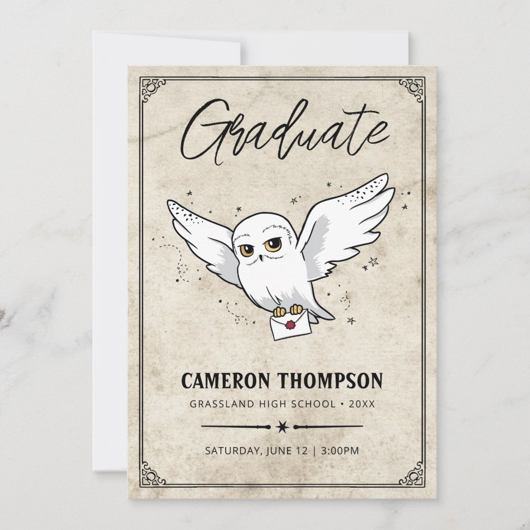 Celebrate a magical achievement with this Harry Potter-themed graduation party invitation featuring Hedwig, the iconic owl. Perfect for fans of the Wizarding World, this invitation adds a touch of Hog